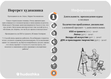 Для нас важно, чтобы каждый получил все преимущества обучения в художественной школе и чувствовал себя свободно и комфортно, как дома. Мы уделяем особое внимание личному взаимодействию.